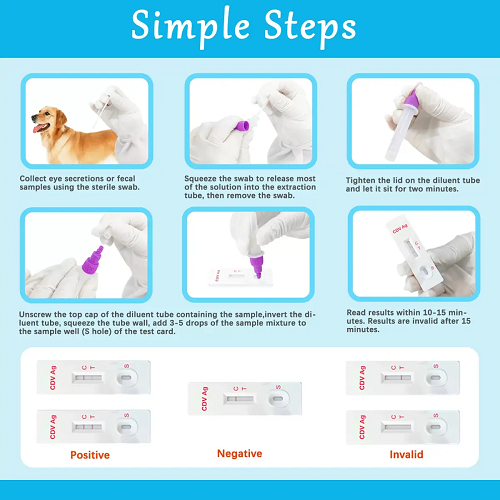 TheSophbabio CDV Ag Test Kitdireka untuk menyediakanHasil kualitatif dalam masa 10-15 minit, mengesan antigen dirembesan mata dan hidungmenggunakan kaedah immunochromatographic sandwic double-antibodi. Dengan jelasC-line dan T-linePetunjuk hasil, kit ini menyokong profesional veterinar barisan hadapan dengan keyakinan dan kelajuan.